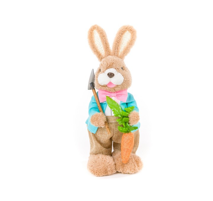 Nossos coelhos de Páscoa fazendeiros são feitos em forma de isopor e cobertos com uma pelúcia deliciosa. Seus arremetes são feitos com cuidado e atenção. O coelho ela uma pá que anda usando para colher suas cenouras e a menina leva uma rede com que brinca pegando borboletas no jardim!
