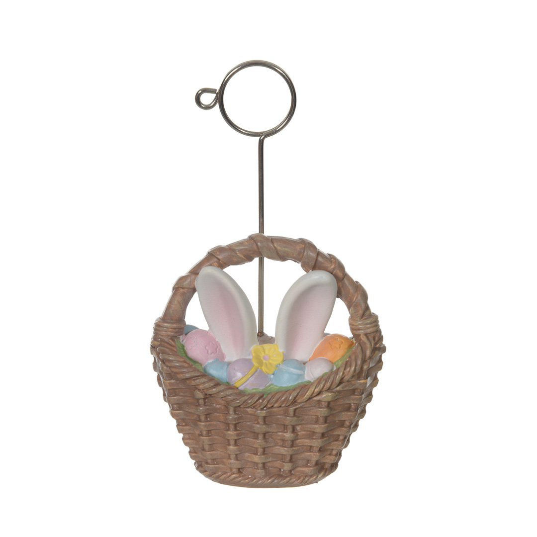 Lindo coelho na cestinha para marcar lugar na mesa com nome do seu convidado ou colocar um bilhetinho de Feliz Páscoa. Em resina, Disponível em dois modelos.